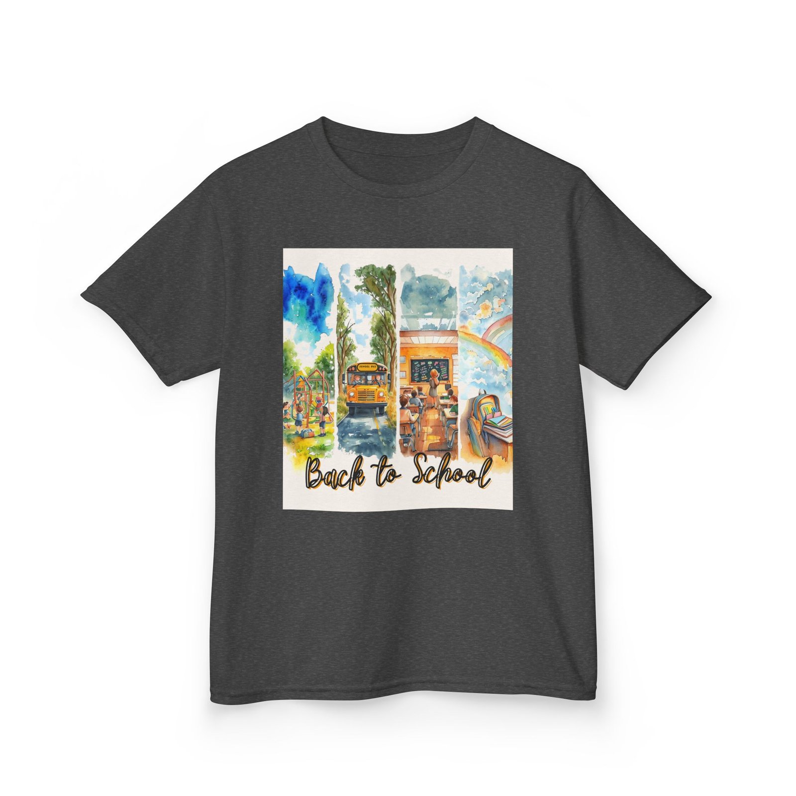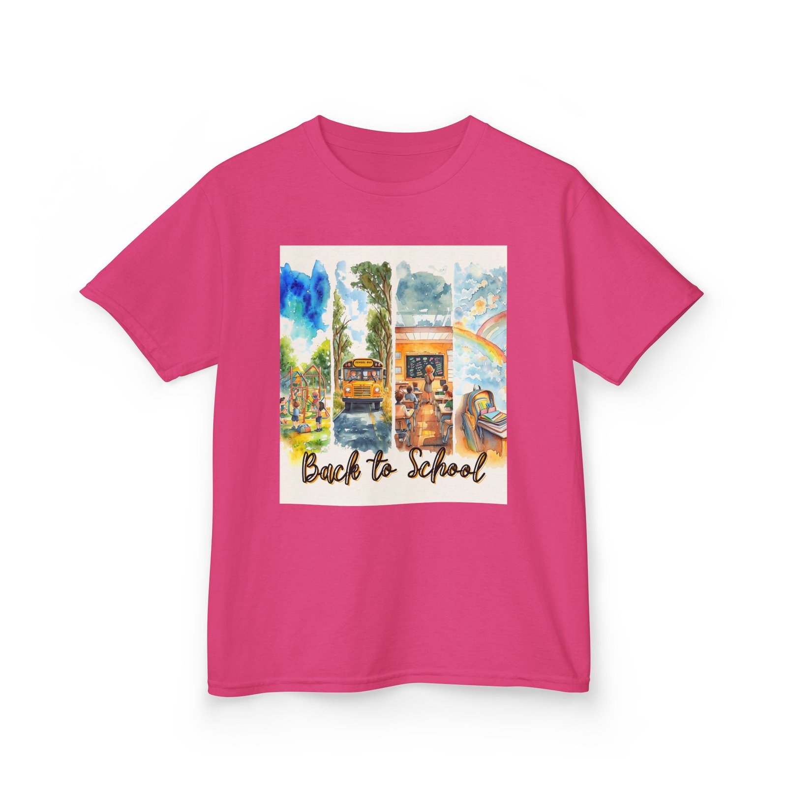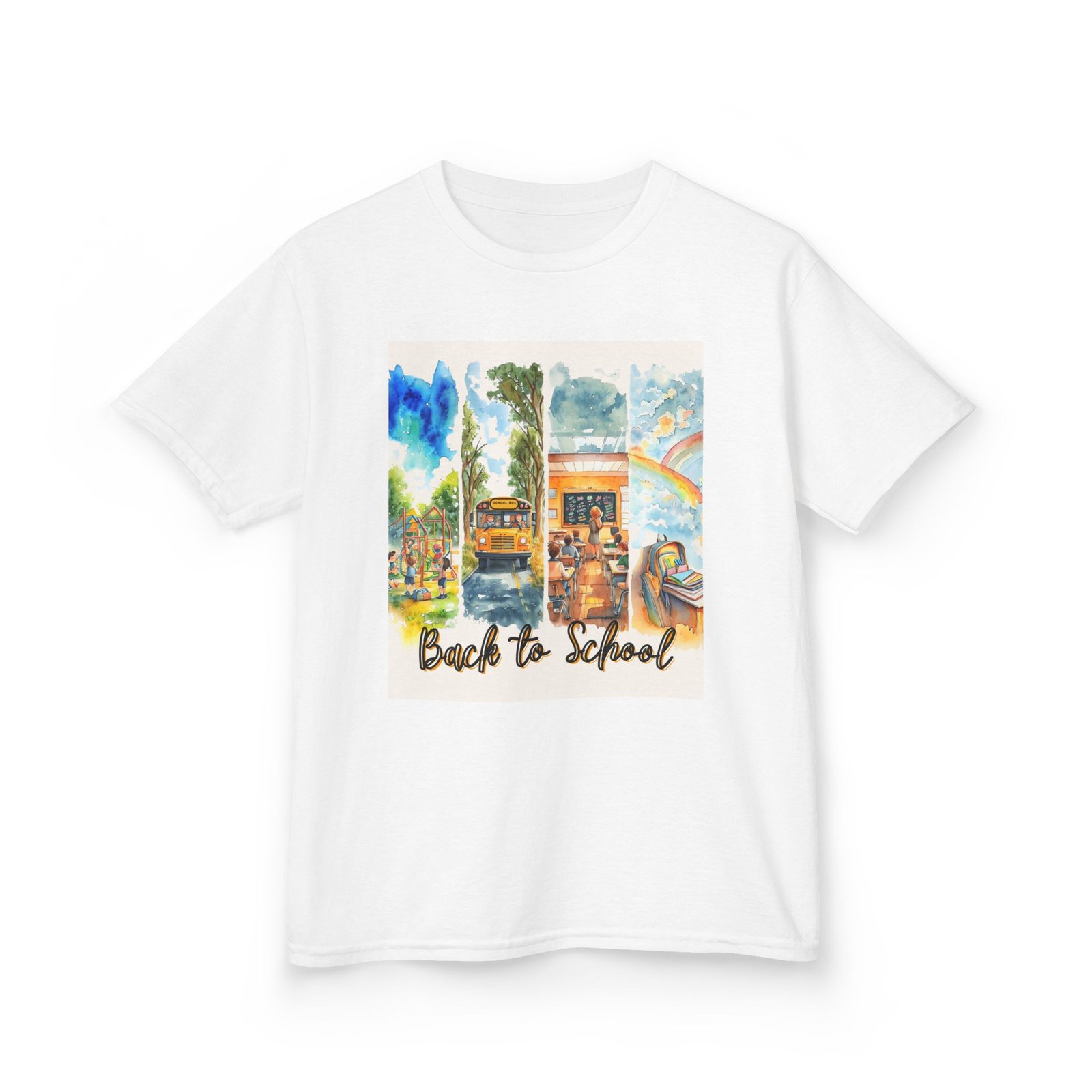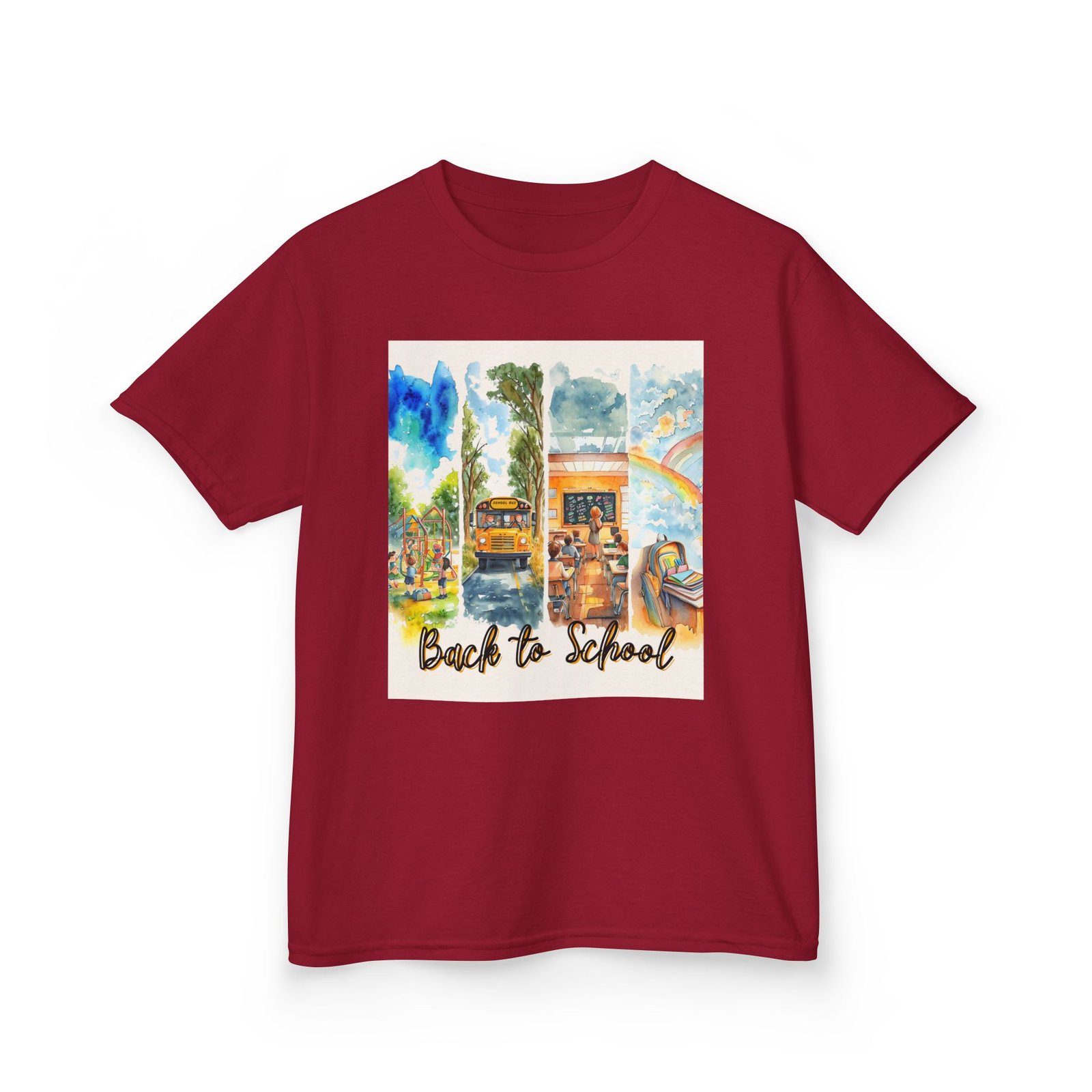 Celebrate the joy of learning with this charming Back to School Kids T-Shirt – designed for little learners who are excited to step back into the classroom! Featuring a whimsical watercolor-style illustration of a school bus, students, and rainbow-filled sky, this tee is more than just clothing – it’s a memory maker.