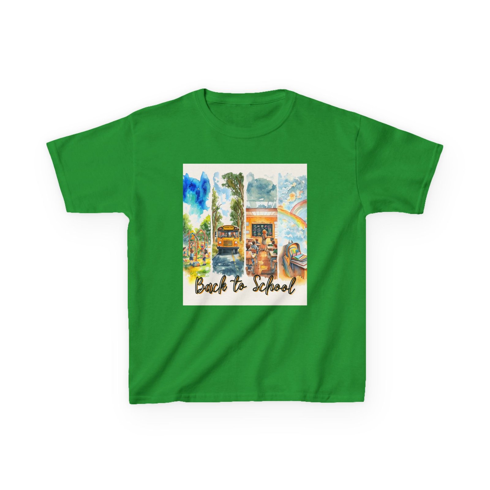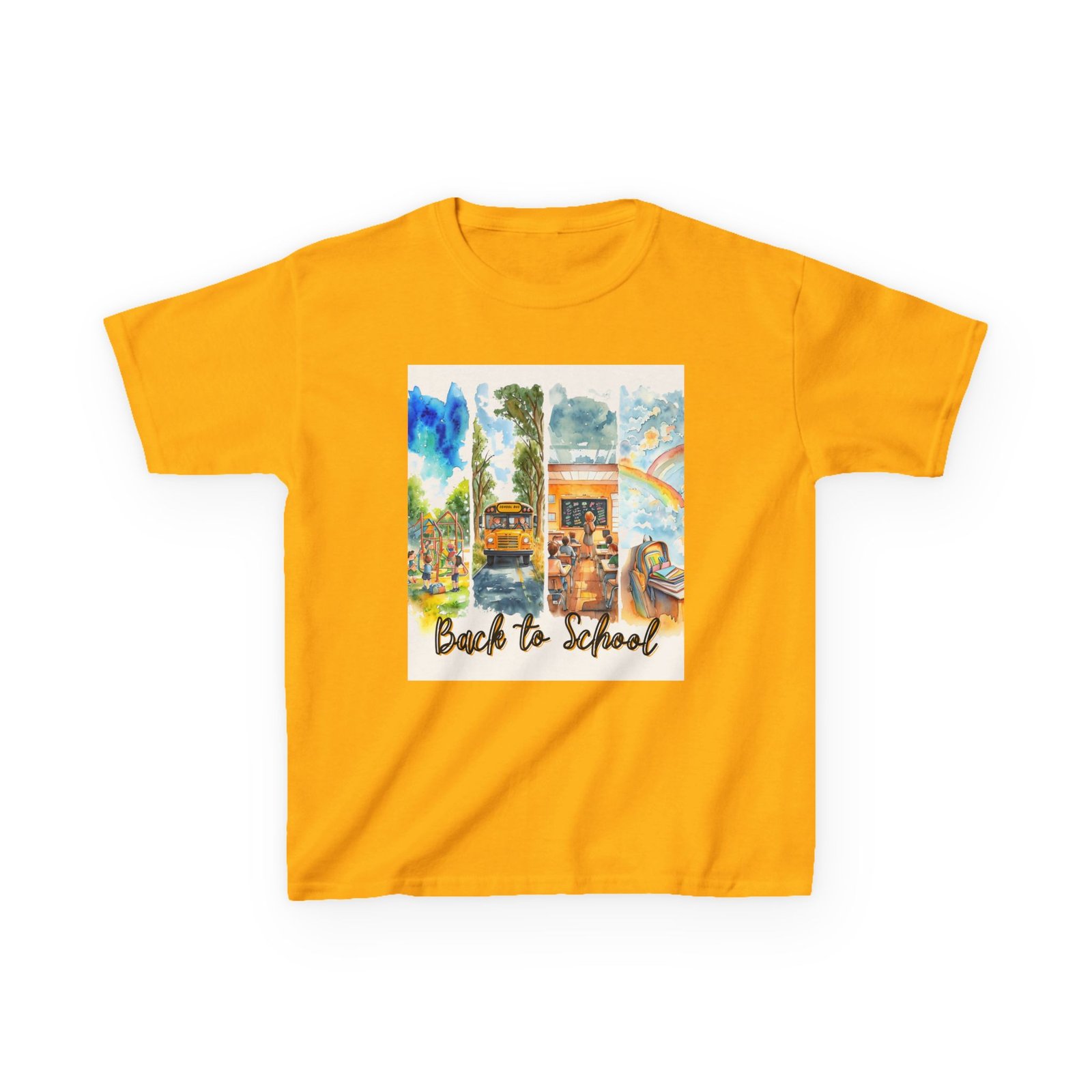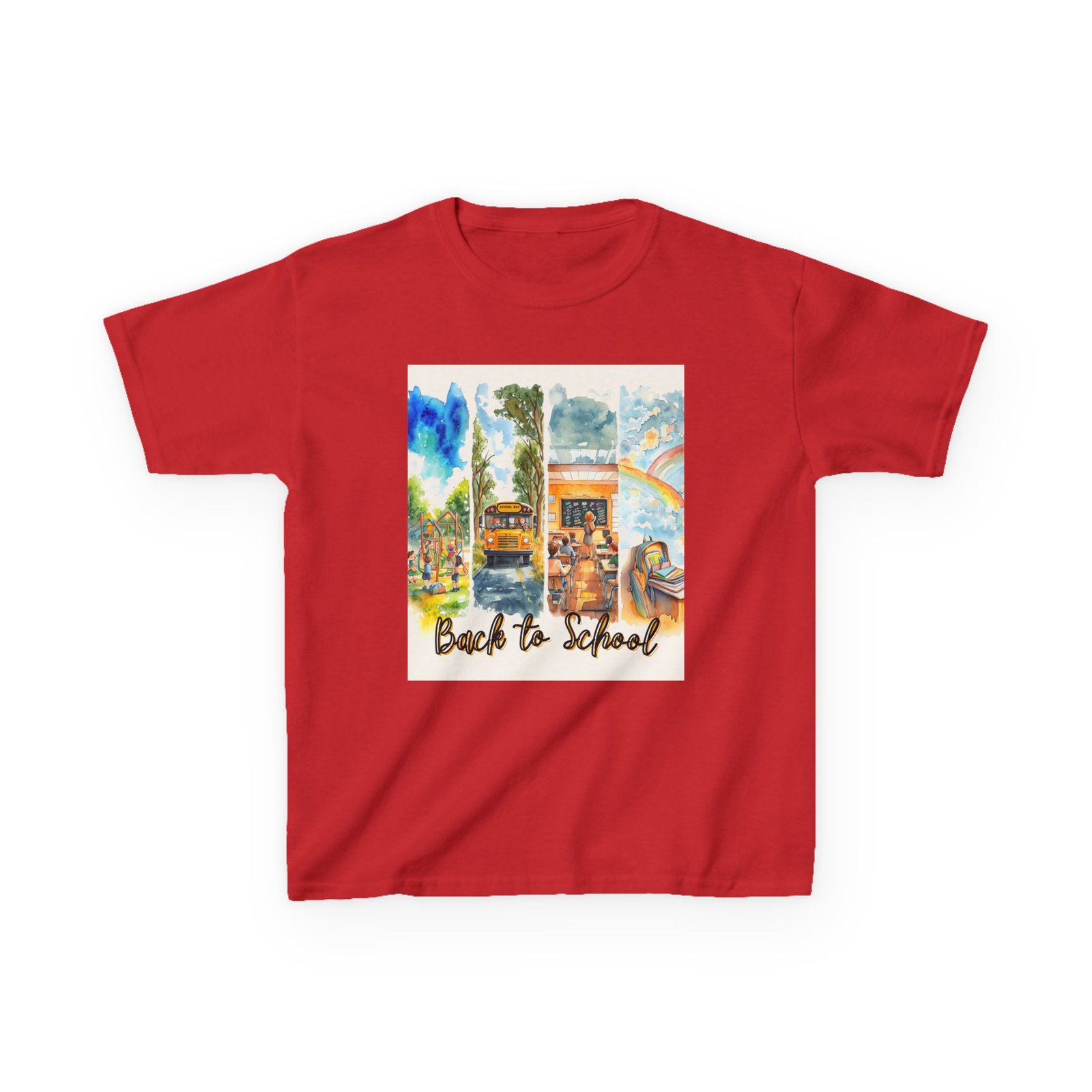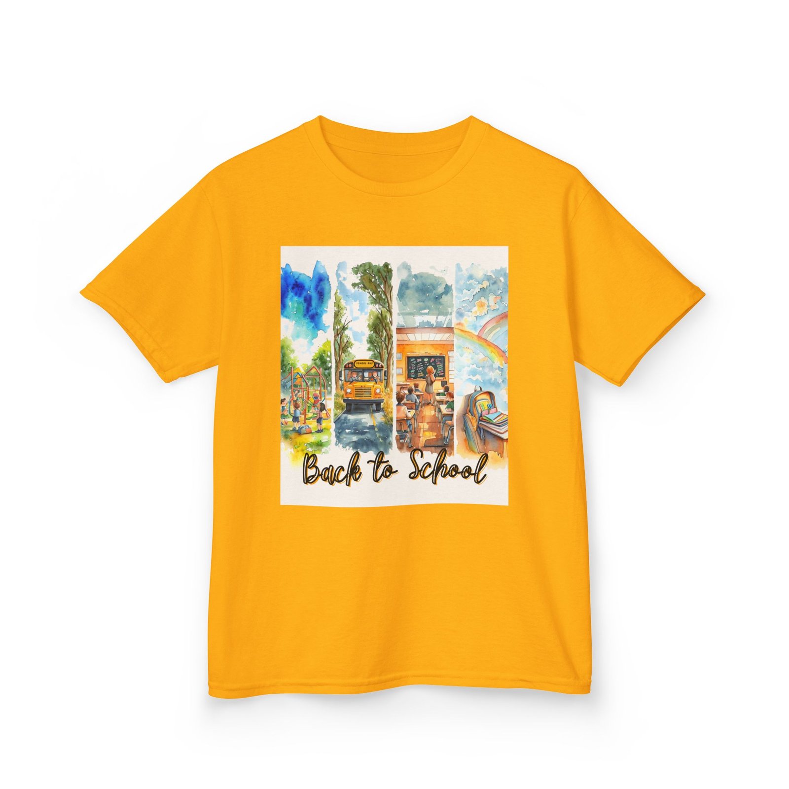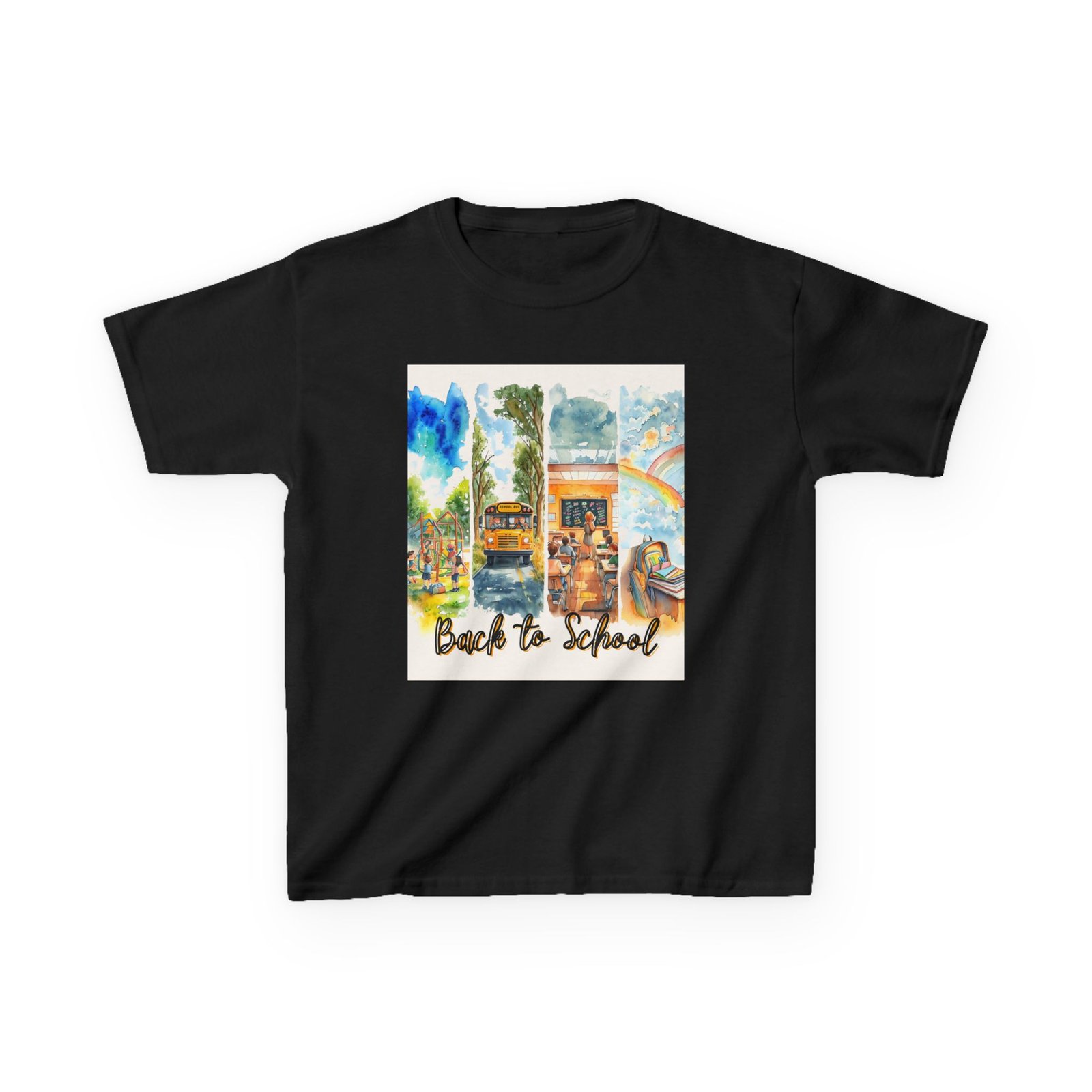 Celebrate the joy of learning with this charming Back to School Kids T-Shirt – designed for little learners who are excited to step back into the classroom! Featuring a whimsical watercolor-style illustration of a school bus, students, and rainbow-filled sky, this tee is more than just clothing – it’s a memory maker.